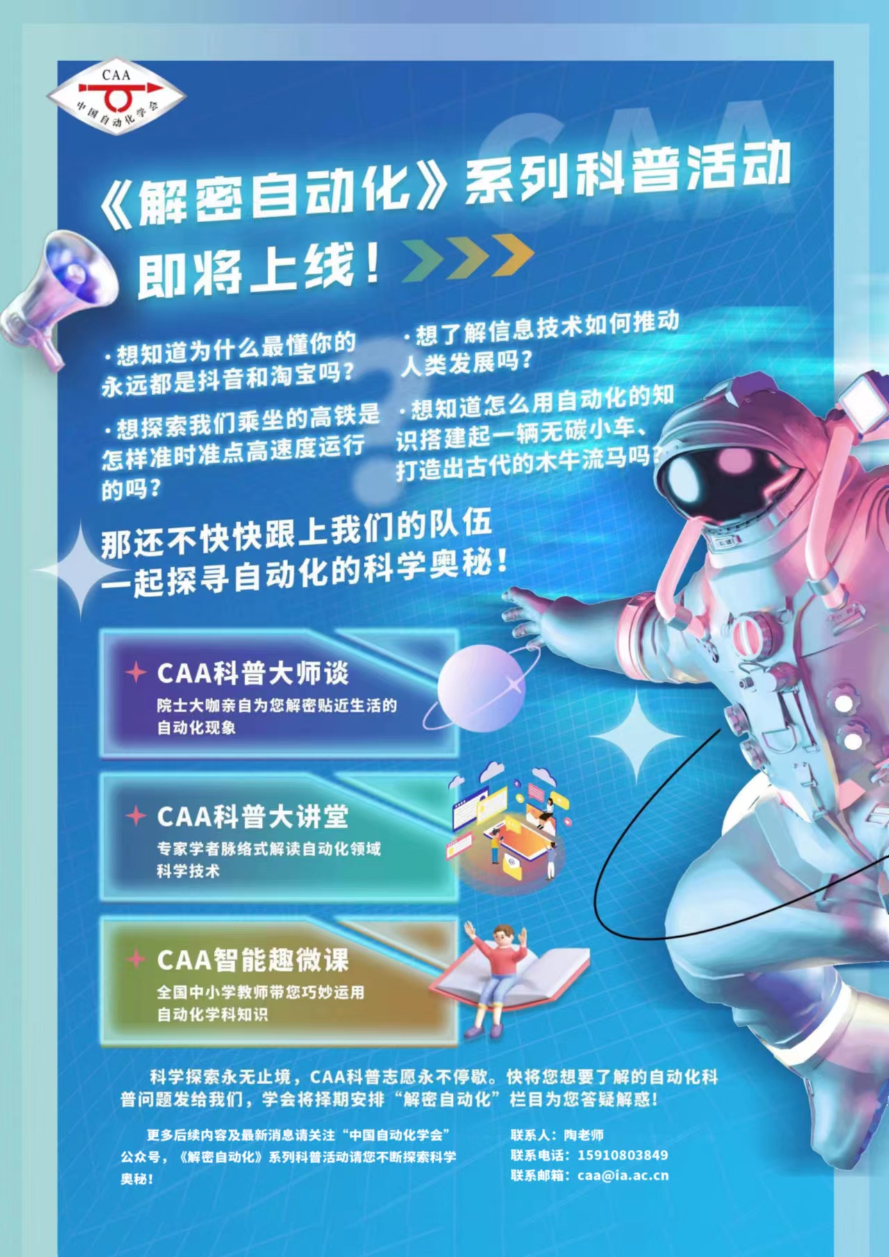 《解密自动化》系列科普活动即将上线!科技创新、科学普及是实现创新发展的两翼,要把科学普及放在与科技创新同等重要的位置。为提高全民科学素质,普及科学知识、弘扬科学精神、传播科学思想、倡导科学方法,欧冠联赛官网全新打造“解密自动化”系列活动,开设《CAA科普大师谈》《CAA科普大讲堂》、《CAA智能趣微课》等多个精彩栏目,快快跟上我们的队伍继续探寻自动化的科学奥秘!