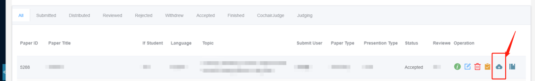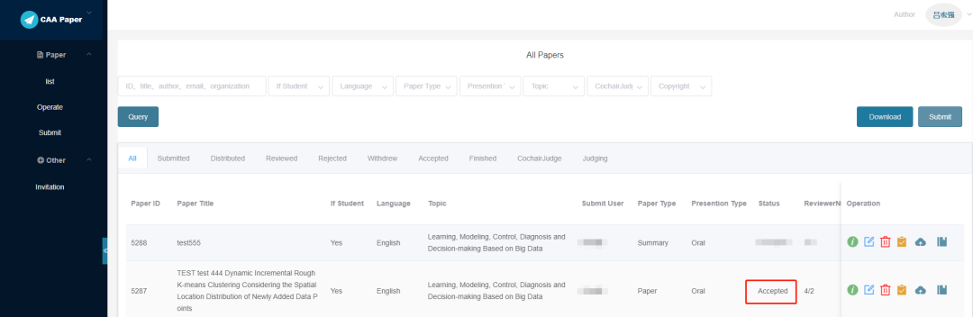 在论文list/operate界面,点击Final Submit按钮,根据系统提示完成相关信息完善,上传终稿论文,完成后点击“FinalSubmit”按钮,完成终稿提交。