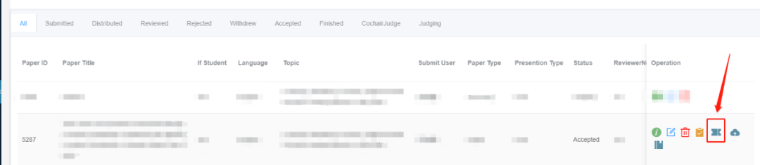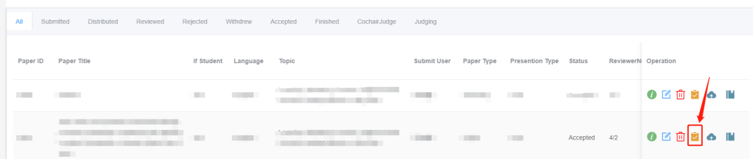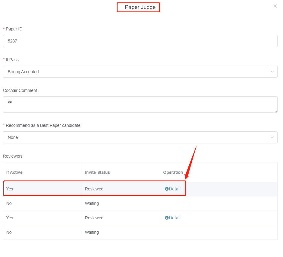在论文list界面,点击judge按钮,进入Paper Judge页面,点击Detail即可查看审稿人意见。