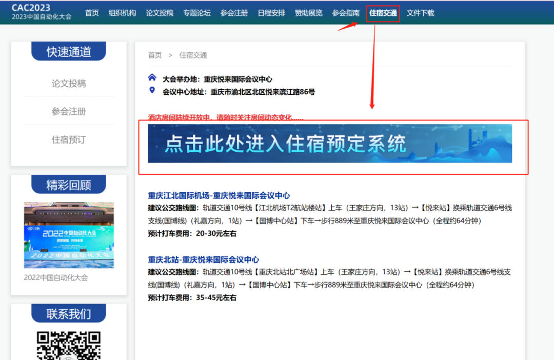 登陆2023中国自动化大会官网—住宿交通—点击进入预订系统