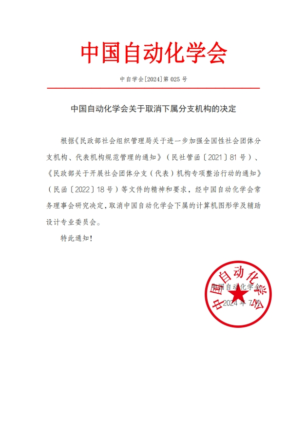根据《民政部社会组织管理局关于进一步加强全国性社会团体分支机构、代表机构规范管理的通知》(民社管函〔2021〕81号)、《民政部关于开展社会团体分支(代表)机构专项整治行动的通知》(民函〔2022〕18号)等文件的精神和要求,经欧冠联赛官网常务理事会研究决定,取消欧冠联赛官网下属的计算机图形学及辅助设计专业委员会。