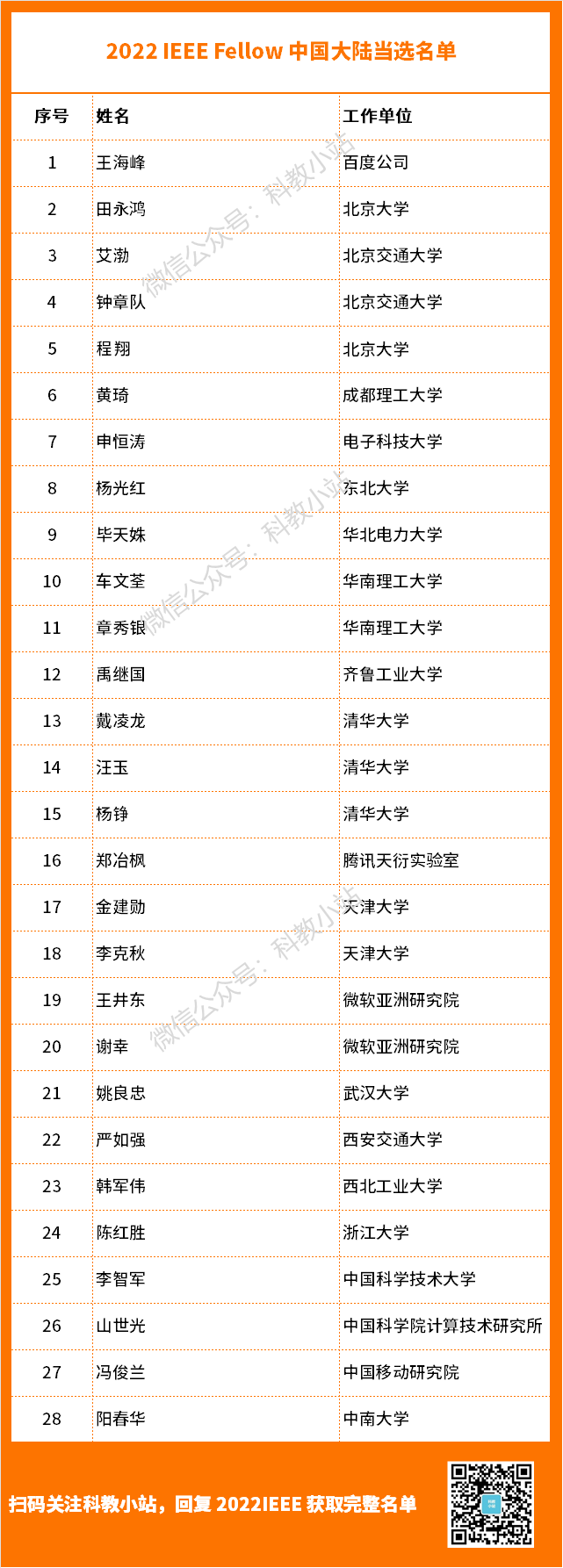 今年中国大陆地区当选人数仅有28人,其中清华大学共有3人,天津大学、北京交通大学、华南理工大学等各有2位学者入围,其余各校均为1人入选。