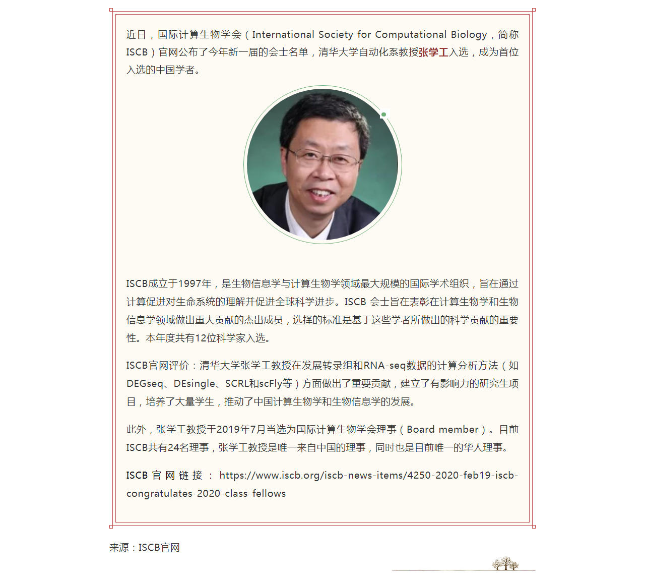 【喜报】学会会员、清华大学自动化系教授张学工当选国际计算生物学会会士