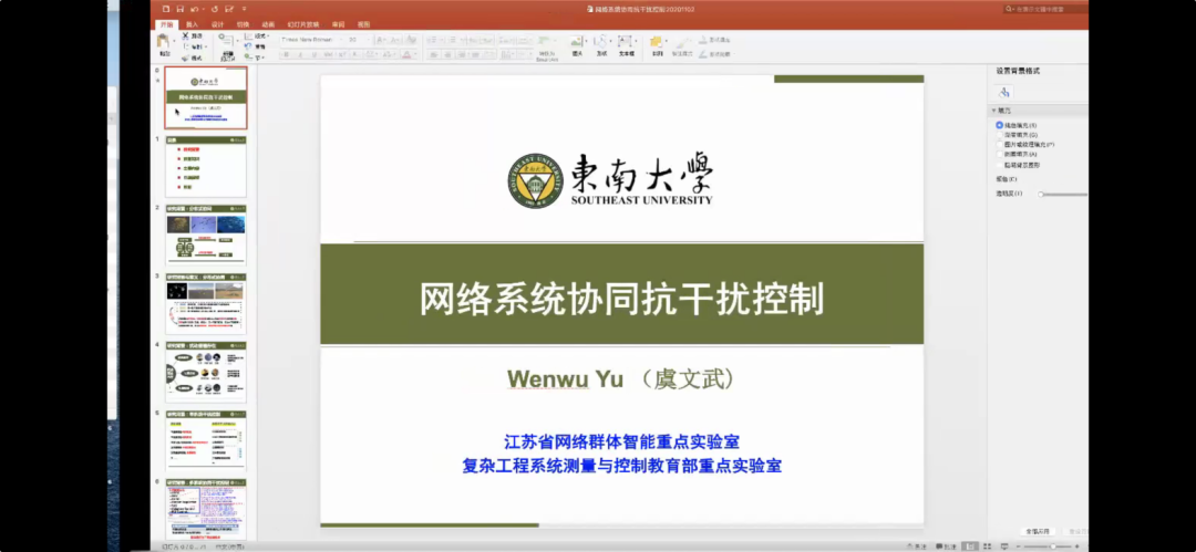 东南大学虞文武教授作题为“多智能体系统协同抗干扰控制”的报告。报告回顾了多智能体系统分布式协同抗干扰控制研究中涉及到的一些主要的结果以及最近的一些进展,介绍了分布式协同变结构控制,分布式协同滑模控制,干扰观测器的分布式协同抗干扰控制,分布式协同输出调节控制等主要的分布式协同抗干扰控制方法。最后虞文武教授也指出了分布式协同抗干扰控制的一些未来的研究方向。