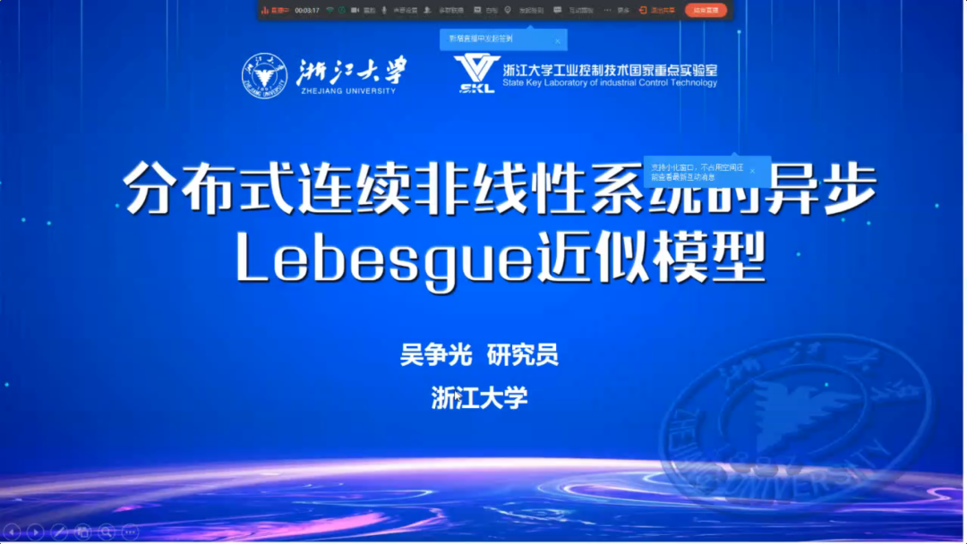 浙江大学吴争光研究员作题为“分布式连续非线性系统的异步勒贝格模型”的报告。近似模型的精确性以及计算效率问题对于以模型为基础的方法来说至关重要。吴争光研究员采用分布式异步的离散时间模型来近似分布式的连续时间非线性系统,其中的子系统间存在物理耦合且能够与邻居节点交换信息,构建了一个分布式的时间触发系统,该系统的状态轨迹与Lebesgue近似模型的轨迹一致。基于此,吴争光研究员进一步给出了Lebesgue近似模型渐近稳定、近似误差有界、避免出现Zeno行为的条件。