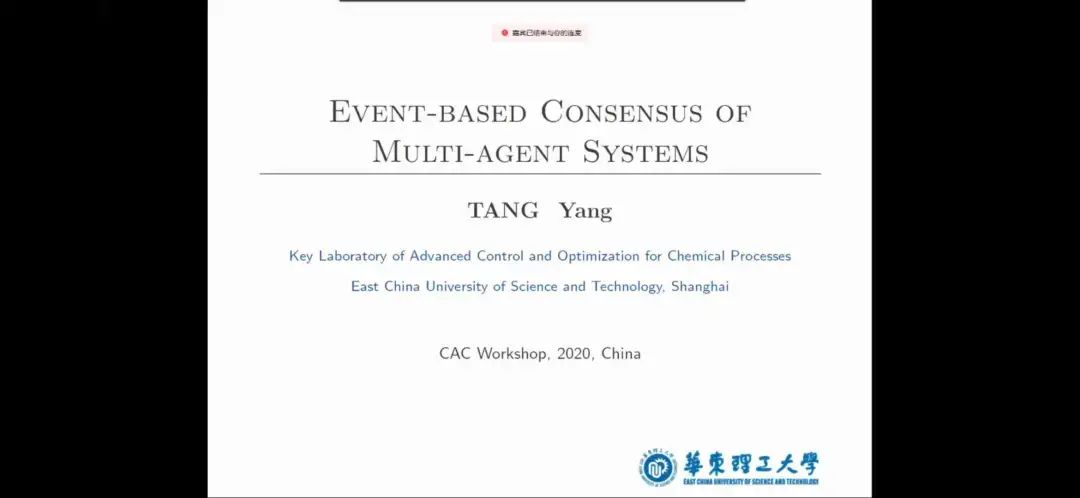 华东理工大学唐漾教授作题为“多智能体系统事件触发一致性”的报告。报告介绍了唐漾教授团队最近在关于多智能体系统事件触发一致性的动力学,姿态动力学和安全基础控制方面的工作。