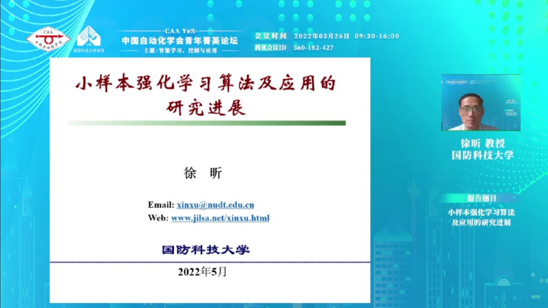 第二位报告人是来自国防科技大学的徐昕教授,报告题目为“小样本强化学习算法及应用的研究进展”。徐教授对当前强化学习求解大规模空间优化决策与控制问题中面临的挑战性问题特别是小样本强化学习问题进行了分析,重点介绍了小样本强化学习在正则化特征表示、基于模型预测的算法设计、知识迁移机制等方面的研究进展,并结合自动驾驶等领域的实际问题进行了讨论。最后,对未来的研究方向进行了展望。