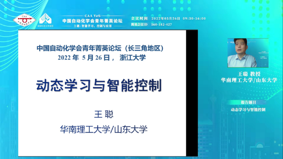 第四位报告人是来自华南理工大学的王聪教授,报告题目为“动态学习和智能控制”。王教授首先介绍了复杂动态环境下进行系统控制的挑战以及智能控制在该场景下的应用发展,并阐述具有可解释性的动态环境机器学习新方法的重要意义。在自适应神经网络辩识与控制的基础上,分享了动态环境机器学习新方法:确定学习或者动态学习。