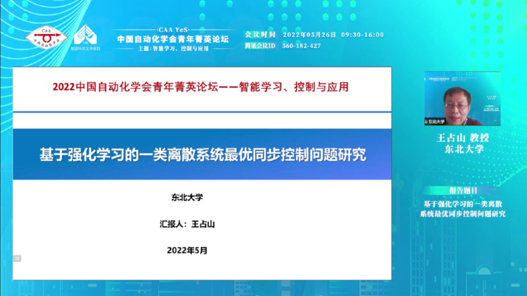 第五位报告人是来自东北大学的王占山教授,报告题目为“基于强化学习的一类离散系统最优同步控制问题研究”。王教授首先针对控制理论中经典的稳定性、同步性、一致性等问题进行了梳理,揭示了三者之间的相对稳定性本质,由此将系统参数辨识、状态估计、跟踪、同步、调节等基本问题统一在一个架构内,进而介绍了基于强化学习的一类离散系统最优同步控制问题,并探讨了自动化与智能自动化之间的关系以及控制作用的时间序列数据本质。