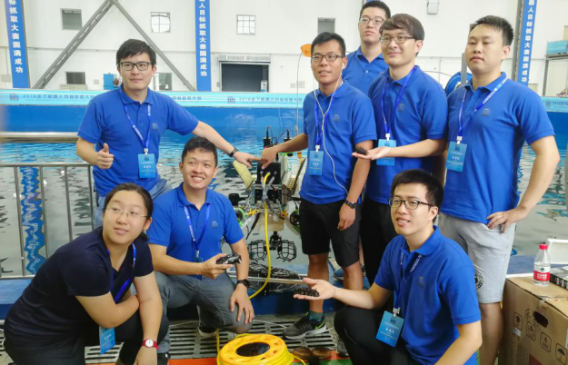 比较难忘的一件事是参加国家基金委主办的水下机器人目标抓取大赛,要在大连獐子岛真实海域下海抓取海参、海胆、扇贝等海产品。海底环境和实验室水池环境存在很大的不同,一个是海底环境下是一种光线退化、生物体堆积、生物体特征不太明显的自然场景,视觉感知与目标定位的难度比较高。另一个是海底存在流和涌等的作用,外部扰动还是比较大的,这对于抓取作业来说还是挺难的。第一年参赛后,我们发现在实验室水池开发的仿生波动鳍推进水下机器人跟真正能下海捕捞海产品的机器人还存在很大差距,第二年我们重新设计了一款混合推进水下机器人,仿生推进主要进行微小姿态调整,螺旋桨推进器主要用来实现大范围的快速运动,经过一番激烈角逐,我们团队取得了目标识别在线组第一名、定点抓取组三等奖的成绩。通过这件事也让我们真切体会到要更加紧密结合实际应用来做研究。