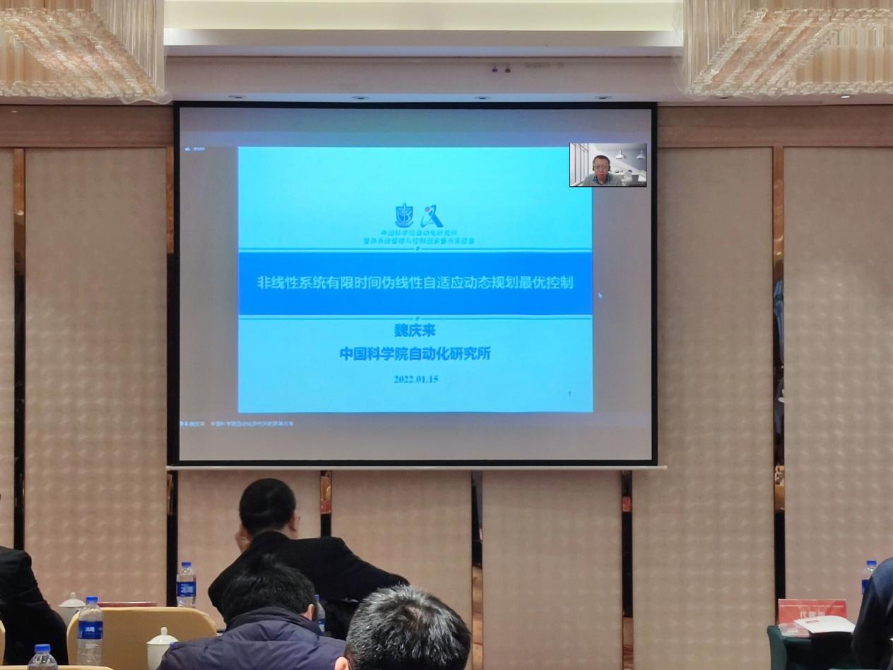 第六场学术报告由南京信息工程大学葛泉波教授主持,由中科院自动化所的魏庆来研究员主讲。魏庆来教授从“非线性系统有限时间伪线性自适应动态规划最优控制”为主题,提出自适应动态规划是一个非常有效的求解最优控制问题的方法,重点介绍了该模型的计算推导过程,并表示欢迎感兴趣的老师与同学进行更深一步的交流。