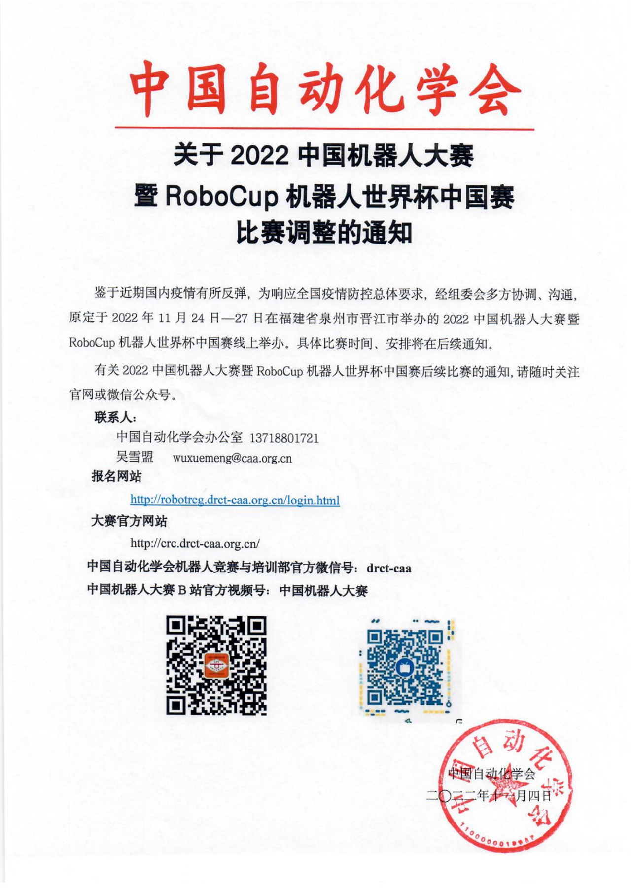 鉴于近期国内疫情有所反弹,为响应全国疫情防控总体要求,经组委会多方协调、沟通,原定于2022年11月24日—27日在福建省泉州市晋江市举办的2022中国机器人大赛暨RoboCup机器人世界杯中国赛线上举办。具体比赛时间、安排将在后续通知。