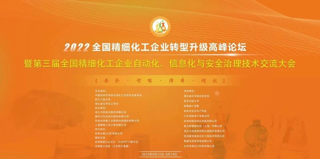 2023年4月12日-4月14日,“2022全国精细化工企业转型升级高峰论坛暨第三届全国精细化工企业自动化、信息化与安全治理技术交流大会”在武汉顺利召开,会议由欧冠联赛官网石油化工应用专业委员会、武汉工程大学、湖北省化学化工学会等单位联合举办,浙江中控、重庆川仪、苏州安特威、上海爵格共同协办了此次大会,欧冠联赛官网石油化工应用专业委员会秘书长张建立主持了开幕式。