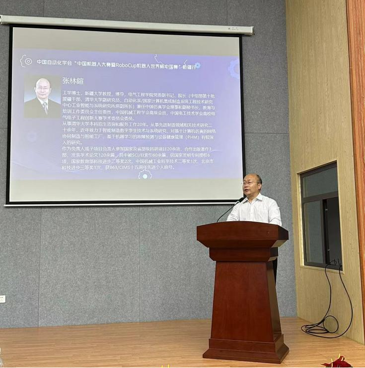 首先,新疆大学电气工程学院院长、中组部清华大学援疆教师张林鍹致欢迎辞,欢迎欧冠联赛官网一行的到来,希望此次大会能够为新疆高校带来宝贵的自动化专业育人经验,并以机器人竞赛为抓手,讨论如何将竞赛与教学、政务、科研、产业相结合,做到产学研政赛的“五位一体”有机结合。