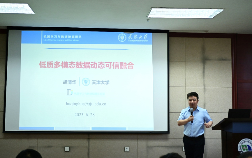 天津大学胡清华教授作了题为“低质多模态数据动态可信融合”的报告,系统梳理了当前多模态数据融合的发展现状以及存在的问题,分析介绍人脑在处理多感官数据融合时的柔性机制,并介绍当前最前沿的多模态数据动态可信融合的模型、算法和应用。胡教授的报告深入浅出,既有理论深度,又有实践应用,引起了现场听众的强烈共鸣和热烈讨论。