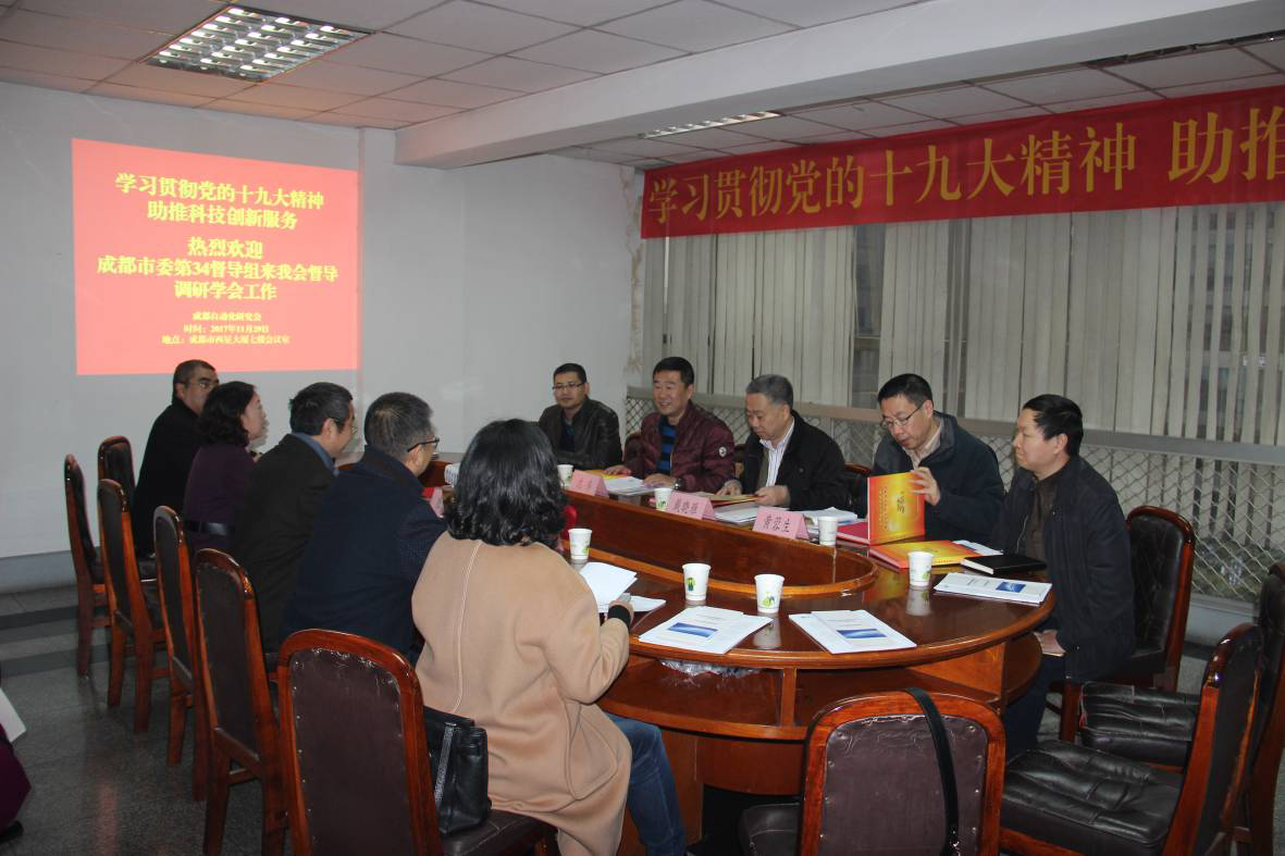 2017年11月29日上午,成都市政协副主席戴晓雁率市委第34督导组到我会开展督导调研工作。市政协相关机构负责人黄蓉生、沈伟、朱泽文,市科协副主席吕毅、办公室主任张耘等同志陪同调研。学会秘书处挂靠单位领导、成都科学技术服务中心主任、书记唐仕正出席汇报。