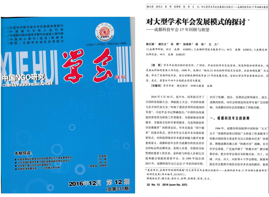 由中国科协学会服务中心、福建省科协主办的《学会》杂志(月刊)于2016年12月在“社会管理工作研究”专栏发表《对大型学术年会发展模式的探讨——成都科技年会17年回顾与展望》一文。论文在回顾成都科技年会17年的发展历程的基础上,对学术年会的重要性认识、宗旨、层次、质量水平四个方面提出思考与展望。
