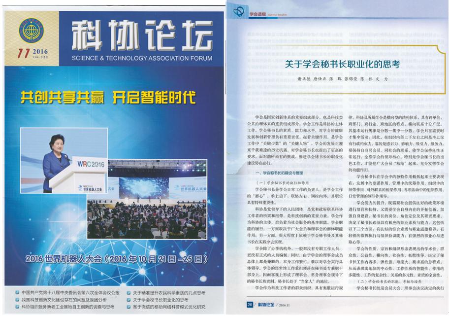 由中国科协主管的《科协论坛》杂志(月刊)于2016年11月在“学会论坛”专栏发表《关于学会秘书长职业化的思考》一文。论文在对学会秘书长的地位、作用、能力、素质、考核、培养等建设与管理进行多视角分析论述的前提下,对学会秘书长职业化的基本概念、内涵等进行了讨论,在结合成都市科协学会秘书长现状调研分析后,提出了推进学会秘书长职业化进程的思考与建议。