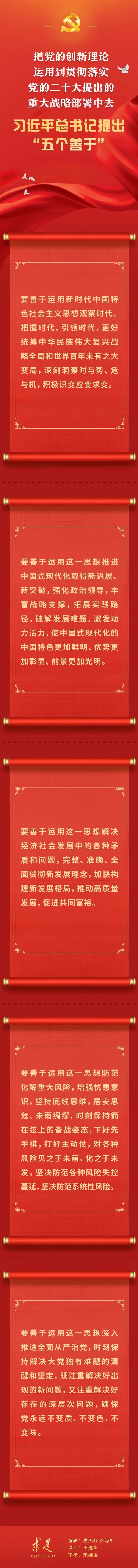 如何把党的创新理论运用到贯彻落实党的二十大提出的重大战略部署中去?在2023年第10期《求是》杂志刊发的习近平总书记重要文章《在二十届中央政治局第四次集体学习时的讲话》中,总书记提出“五个善于”的明确要求。