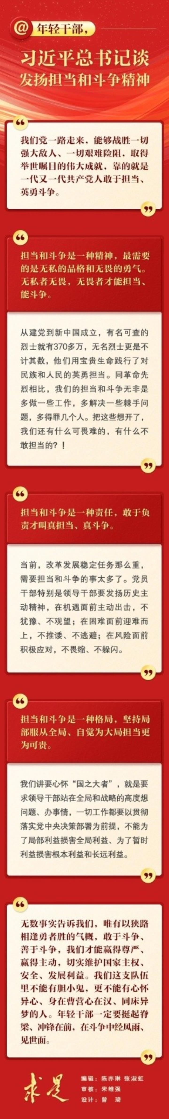 在2023年第13期《求是》杂志刊发的习近平总书记重要文章《努力成长为对党和人民忠诚可靠、堪当时代重任的栋梁之才》中,总书记深刻阐释“担当和斗争精神”,强调“只有全党继续发扬担当和斗争精神,才能实现中华民族伟大复兴的宏伟目标”,“年轻干部一定要挺起脊梁、冲锋在前,在斗争中经风雨、见世面”。