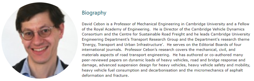 其中,David Cebon教授的报告为Improving heavy goods vehicle safety, productivity and sustainability,概述了重型货车在现代社会中的重要性及其复杂的动力学特性,讨论了过去四十年间为提升安全、效率和环保性能在重型货车动力学上的研究。