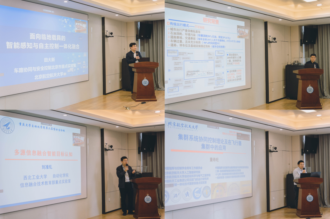 自动化学院院长苏晓杰为此次论坛做开幕词,对各位专家的莅临表示欢迎和感谢,并预祝论坛顺利举行。在“特邀专家讲座”中,各位专家从不同角度出发,从理论到实践,从宏观到微观,探讨了智慧交通与智能控制领域的前沿知识和实用技术。北京航空航天大学田大新教授就自主智能临地载具的研究思路和关键核心技术做出了深入的探讨和分析,展示了团队在自主智能临地载具系统装备和样机的集成研发、测试验证以及示范应用方面的最新进展;东北大学郭戈教授针对AI赋能的网联共享交通出行,就车联网中的车辆通信调度、车辆行车间距和行车路径动态优化设定、车辆队列的协同行驶控制等方面的问题及其解决方案进行了系统的介绍与分析;西北工业大学刘准钆教授详细介绍了先验知识匮乏下SAR目标检测、多模态融合开集目标识别、模型与数据联合驱动空中高机动目标跟踪以及不确定环境下目标意图鲁棒推理等方法,并探讨了智能目标认知面临的若干前沿问题;北京航空航天大学董希旺教授分别介绍了集群系统协同控制中的分布式时变编队控制技术与编队跟踪控制技术及编队-合围控制技术,并演示验证了提出技术的有效性;浙江大学朱政研究员分享了团队在网约车、共享单车系统时空运营优化研究中建立马尔可夫决策过程的思路与经验,并探讨了共享出行系统马尔可夫性及建模取舍。