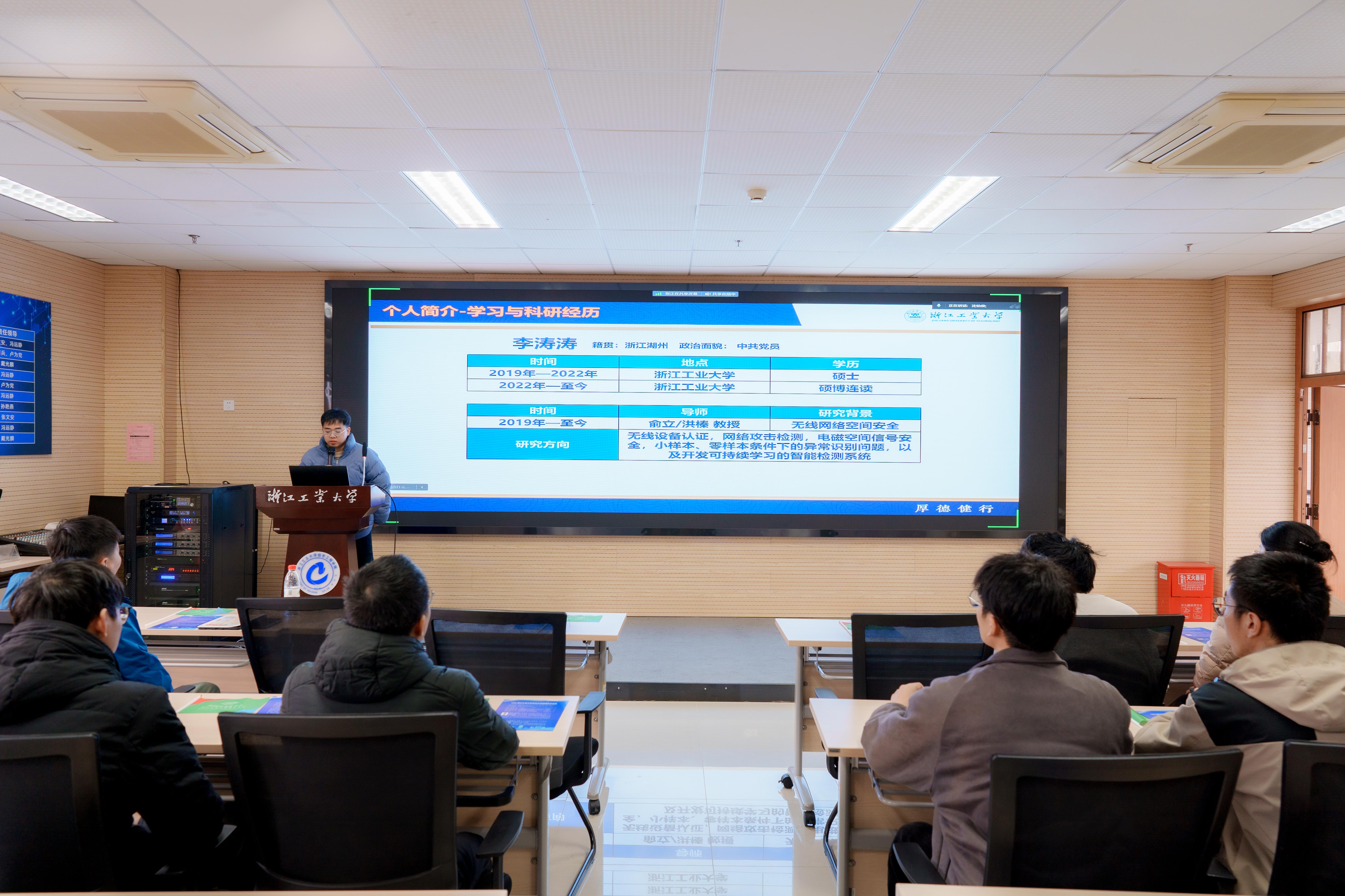本次硕博学术论坛邀请的两位嘉宾进行报告。报告人李涛涛是信息工程学院22级博士研究生,发表了IEEE TPAMI 等ZJUT-100,CCF-A期刊论文2篇,其他期刊或会议论文5 篇,在投ZJUT100CCF-A 论文3篇,参与了面向跨层攻击的工业信息物理系统源位置隐私保护理论研究(国家自然科学基金),参与工业控制系统源位置安全攻击与保护机制研究(浙江省自然科学基金),并参与了华为界腾众智项目开发。在报告中,他向参会学生们分享了顶级期刊论文写作思路及科研经验,回顾了硕博连读期间的科研经历与感想,并以自身经验讲述研究生如何写好顶级期刊论文。
