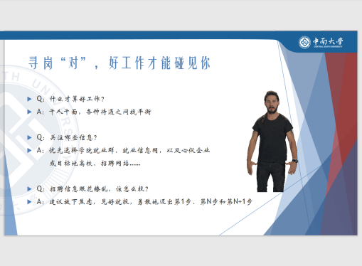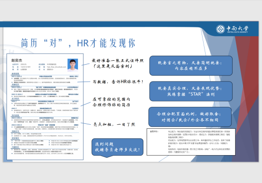 最后,同样是中南大学2025届毕业生的赵奕杰同学从找岗位、写简历、去面试三个方面来为同学们详尽介绍,并举了一些正面和方面例子,言简意赅,让同学们收获颇丰、受益匪浅。