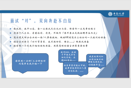 首先,来自中南大学2025届毕业生陈旭同学分享了自身经历,包括就业预期、简历制作、资源分析等方面,从亲身经历中总结的经验分享给同学们,干货满满;同时也为同学们提供了一些面试技巧,让同学们自信、阳光。