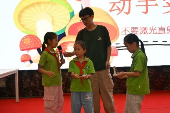 在互动环节,孩子们被分成若干小组,每组用领到的实验器材开始动手制作激光报警器。孩子们兴奋地拼装材料,互帮互助,认真观察实验现象,在志愿者同学们的指导下完成了实验。当看到自己亲手制作的实验装置成功运作时,孩子们的脸上洋溢着自豪和喜悦的笑容,较先完成器材安装和实验验证的孩子到讲台上向大家分享自己组装和实操实验的技巧方法,这极大的激发了孩子们的学习兴趣和成就感。