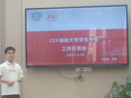 湖南大学周辉同学对CCF湖大分会的成立过程、分会承办过的活动进行了详细介绍,在学术管理、活动策划以及会员服务等方面使其他分会成员产生共鸣、收获颇丰。同时对未来分会的发展工作做了规划和展望。