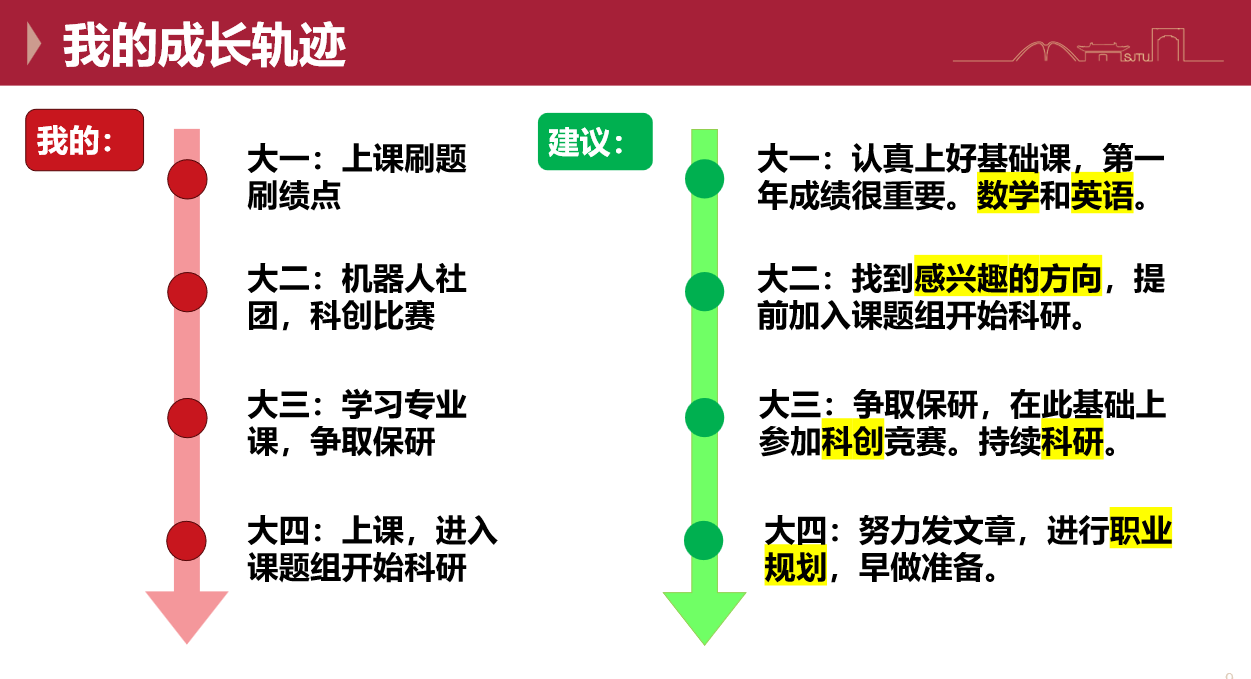 分享会伊始,苟凡棣首先向同学们强调了职业规划的重要性,鼓励大家在当前阶段广泛尝试方向,找到自己真正感兴趣并热爱的领域。苟凡棣以目标函数为喻体,期望大家能够找到自己人生的目标函数,而非一味在固定的价值评价体系中内卷。同时,他还强调在培养动手能力的同时还需要注重语言表达能力和沟通能力的培养,对于科研和科创而言,在把事情做好的同时,把故事讲好也同样重要。在这个主题分享的最后,他针对“应该如何过好大学生活”这一问题提出了自己的建议。
