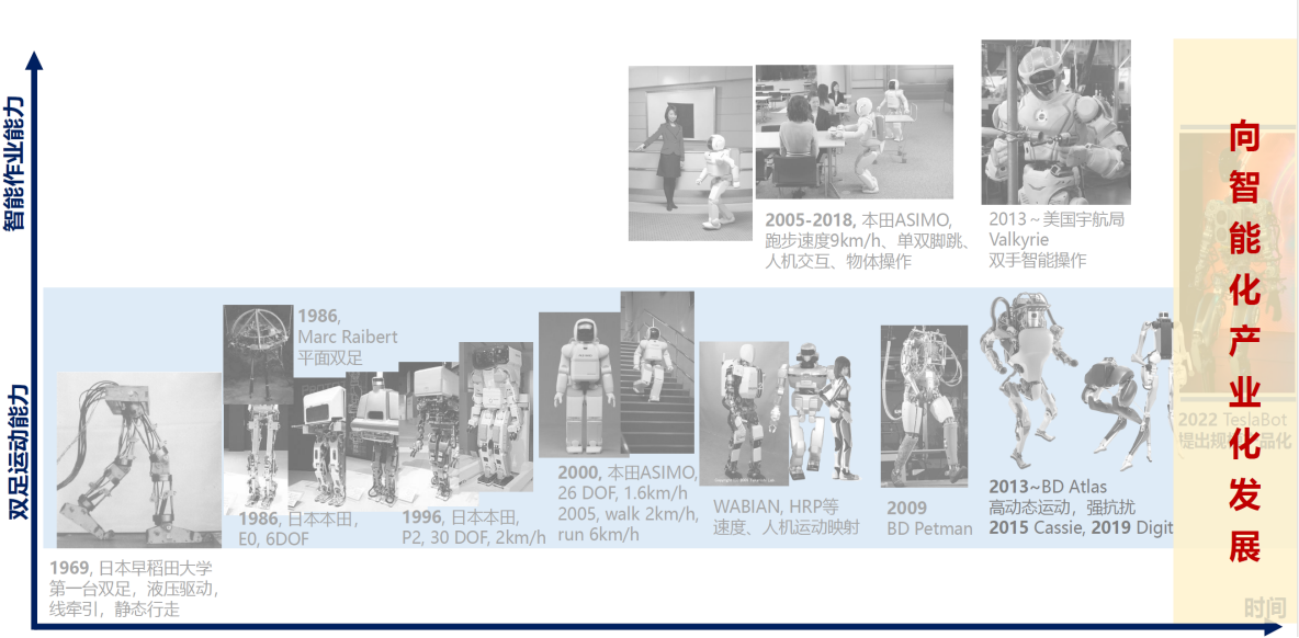 2000年之后,人形机器人的研究取得了更多的进展。例如,ASIMO等研究机构不断优化和改进机器人的行走速度,并引入了人机运动映射技术,使机器人能够执行更复杂的动作。同时,研究人员进一步结合智能技术,使机器人具备与人类进行交互的能力,例如为人端茶递物。自2009年起,波士顿动力公司开始致力于满足美军的需求,并在福岛核电站事故后开始研究高动态运动的人形机器人,以便执行特种任务。这一阶段研究领域形成了不同的技术流派,包括多种不同的平衡控制技术以及不同的驱动技术。这些技术的发展使得人形机器人的技术变得多样化且具有广泛的应用前景。在2022年特斯拉所发布的人形机器人,马斯克关于人形机器人方面的一系列的规划、布局,引起了世界的广泛关注。