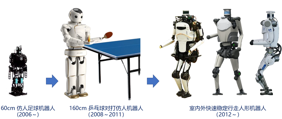 但是机器人打球的过程中,主要依靠下肢来进行平衡控制。由于行走速度仅达到1.2公里/小时,无法跟上快速打球的节奏。因此,从2012年开始,我们的研究重点转向如何提高机器人的行走速度,并使其能够在室内外不平整的地面以及各种未知扰动下行走。同时,还着重考虑了上肢运动的结合,为机器人的发展奠定了基础。