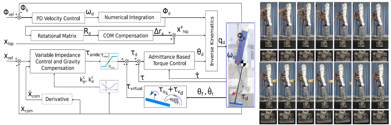 通过研究,我们发现虚拟模型控制方法在降低对精确模型依赖性方面取得了进展。然而,在复杂环境下,虚拟模型控制的容错性存在限制。因此,我们进行了相关研究,并借鉴人类保持平衡时的行为策略。与传统方法不同,人类在受到扰动时采用踮脚的方式来保持稳定,从而缩小了稳定域的范围。我们在理论上证明,只需保持在稳定域边界上即可实现稳定性,而不需要较大的稳定域和支撑域。进一步,基于虚拟模型的思想,我们提出了一种通过足部倾斜主动控制来增加稳定域的方法,如图6所示。在人形机器人上成功实现了该方法,并发表了高水平的论文。然而,人形机器人在多个虚拟模型的结合和协调方面存在一定限制,以及在不同场景下设计不同虚拟模型的通用性的挑战。
