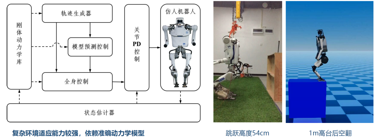 所以,采用模型预测控制和全身控制的方法可以提高人形机器人的动作稳定性和协调性,如图7所示。这种方法基于轨迹规划和刚体动力学建模,通过模型预测控制计算地面反作用力和力矩,并结合全身控制生成关节力矩。通过该集成控制策略,我们能够更准确地预测和调整机器人的运动,使其能够在复杂环境中实现稳定的运动和协调的动作。在仿真环境中已经实现了一些复杂动作,如跳跃和后空翻,但仍需要进一步提升关节力矩以实现更高水平的执行能力。我们将继续努力改进和优化控制方法,以进一步提升人形机器人的运动能力和执行复杂动作的能力。