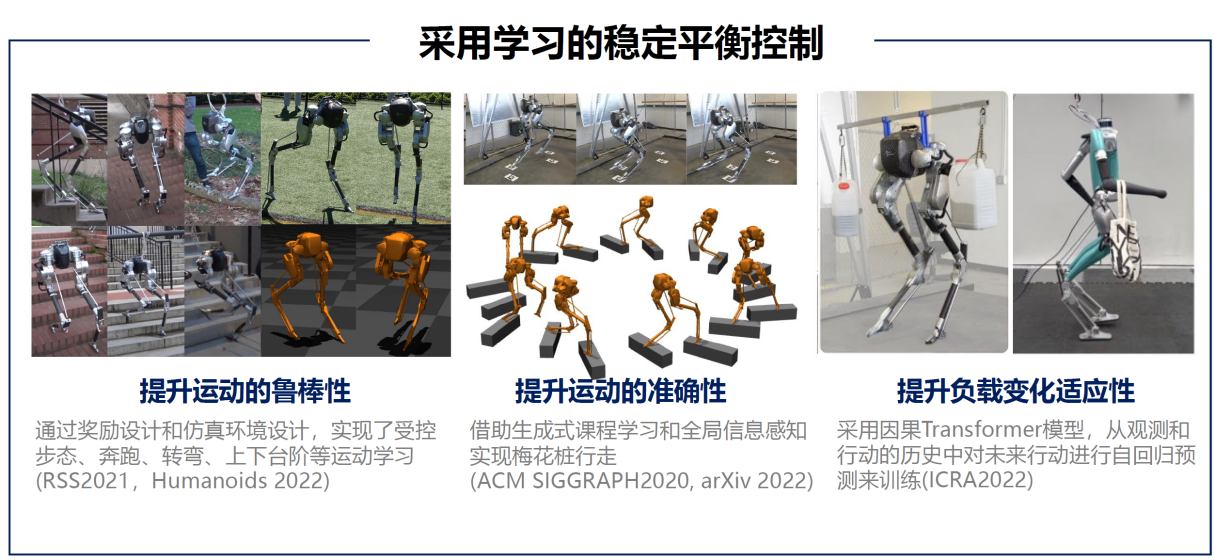 在人形机器人的技能方面,我们重点关注它的稳定平衡运动能力,并进行了相关的研究工作。目前,主要有两种方法:一种是传统的基于模型的方法,通过建立机器人的运动学和动力学模型,进行摆动腿的轨迹规划,进而开展平衡控制。除了传统的方法,另一种是采用学习的方法,如模仿学习和生成学习,来生成机器人的运动和控制策略。