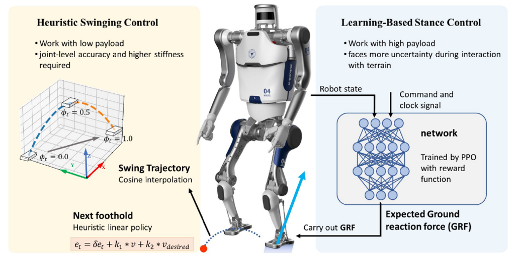 然而,在应用纯强化学习方法于人形机器人时,由于人形机器人具有相对较小的稳定时空域,这导致获得稳定案例和进行迭代学习的速度较慢。因此,我们提出了将模型方法与学习方法相结合的策略,如图10所示。通过采用启发式模型来规划摆动腿的运动,该模型对支撑腿的参数高度依赖,而对于参数依赖较强的情况,可以采用学习方法。通过串并联混合的方法,加速了学习过程,并提高了对质量、扰动和噪声等因素的鲁棒性。然而,人形机器人仍然容易受到地面不平整等因素的影响。为此,需要引入了隐藏空间的学习,采用教师-学生模型,通过从一些优秀模型中学习隐藏空间的映射关系,可以进一步提升机器人稳定性。目前,浙大人形机器人已成功实现了在15-18厘米地形起伏的不同环境下稳定行走,并达到了3公里/小时的速度。