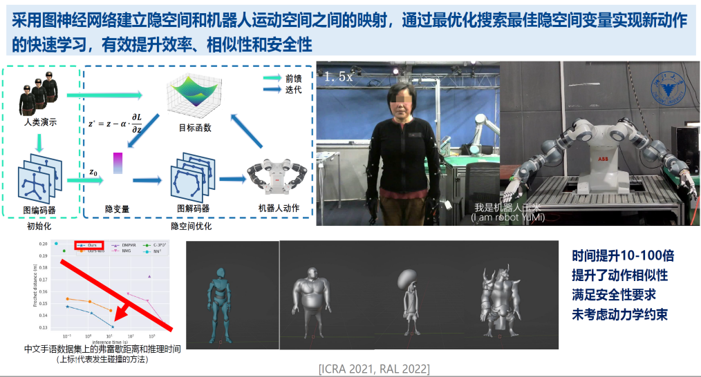 此外,在运动学习和强化学习生成方面,浙大团队也做出了一定的贡献。通过图神经网络构建学习模型,并结合最优化搜索,在编码后的隐藏空间中寻找最佳匹配,之后进行最优化搜索,以实现对大型动作序列的快速学习,如图11所所示。结果显示,学习时间提升了10-100倍,同时动作相似性评估也有了显著提升。