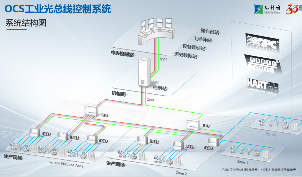 和利时集团在行业用户数字化转型的过程中,针对用户面临的主要挑战,推出了OCS工业光总线控制系统,如图1所示。该产品有两大特点:首先,采用软件定义I/O技术实现数字布线,避免了传统DCS系统中因I/O卡件专用化而带来的施工成本和低效率问题;其次,利用工业光总线技术实现一光通达,即从现场到机柜间全程光纤传输,在成本优势下提供了高带宽、传输效率更优且抗干扰性强的解决方案。OCS的推出旨在帮助用户降低获取和传输现场数据的成本,同时降低工程设计的复杂性。