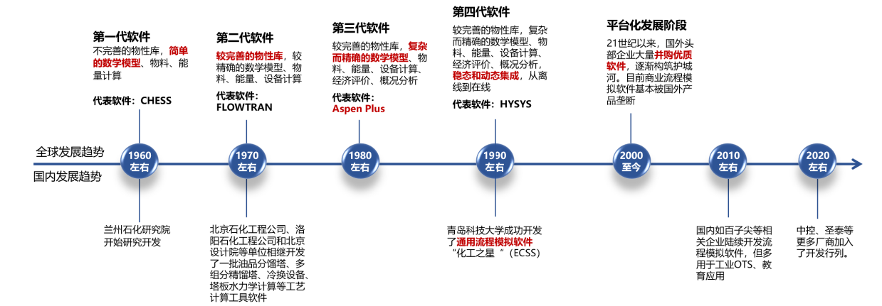流程模拟仿真本质上是利用计算机等各种手段来模拟现实世界的实体。然而,由于仿真对象的不同,导致仿真模拟的难度和复杂度大相径庭。回顾历史,如图2所示,可以发现大约在1960年左右,国内外均开始涉足这个领域。当时最早的软件之一是CHESS,同时兰州石化在流程模拟仿真方面也开始了相关研究,可以看到在世界范围内涌现出了一批相当出色的工业软件。