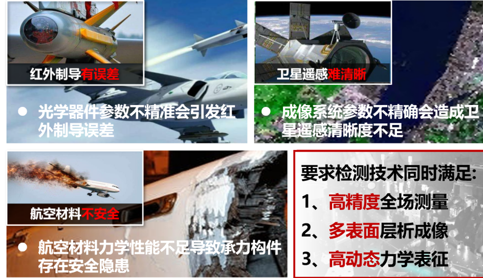 高精度检测在树脂复合材料重大装备方面至关重要,主要涵盖三个主要方面:第一,实现对树脂复合材料的高精度全厂测量,确保其结构、尺寸、形状等符合质量标准和设计规范;第二,实现多表面成像技术,以获取复杂构件多个表面的细节和结构信息,便于全面分析评估;第三,具备高动态范围的力学特性表征能力,特别是在极端环境下对材料性能进行准确测定,如图1所示。树脂复合材料被广泛应用于航空航天等领域的承力构件,其高强度、耐高温和低密度等优点使其备受青睐,对它进行高精度检测是确保其质量、安全性和可靠性的关键。