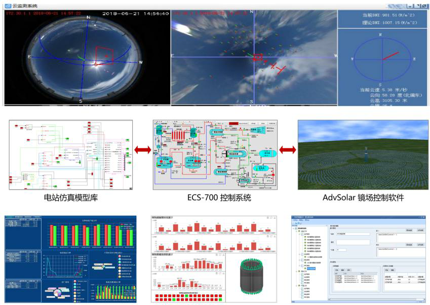 塔式太阳能热发电系统的软件可以分为多个类别,包括高精度校正系统软件、监控系统软件、云检测软件、仿真培训软件和运营优化平台软件。这些软件的功能包括镜场管理、能量管理、气象监控与预测、操作培训、运行优化和性能分析。当前的系统在精度方面已经实现了1.65mrad,满足了面积达到300万平方米的镜场需求。每天可以校准5000台的定日镜,其对定日镜利用率的影响在1%以内。