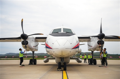 7月17日,在乌兰察布集宁机场,工作人员检查国产中型遥感飞机平台。